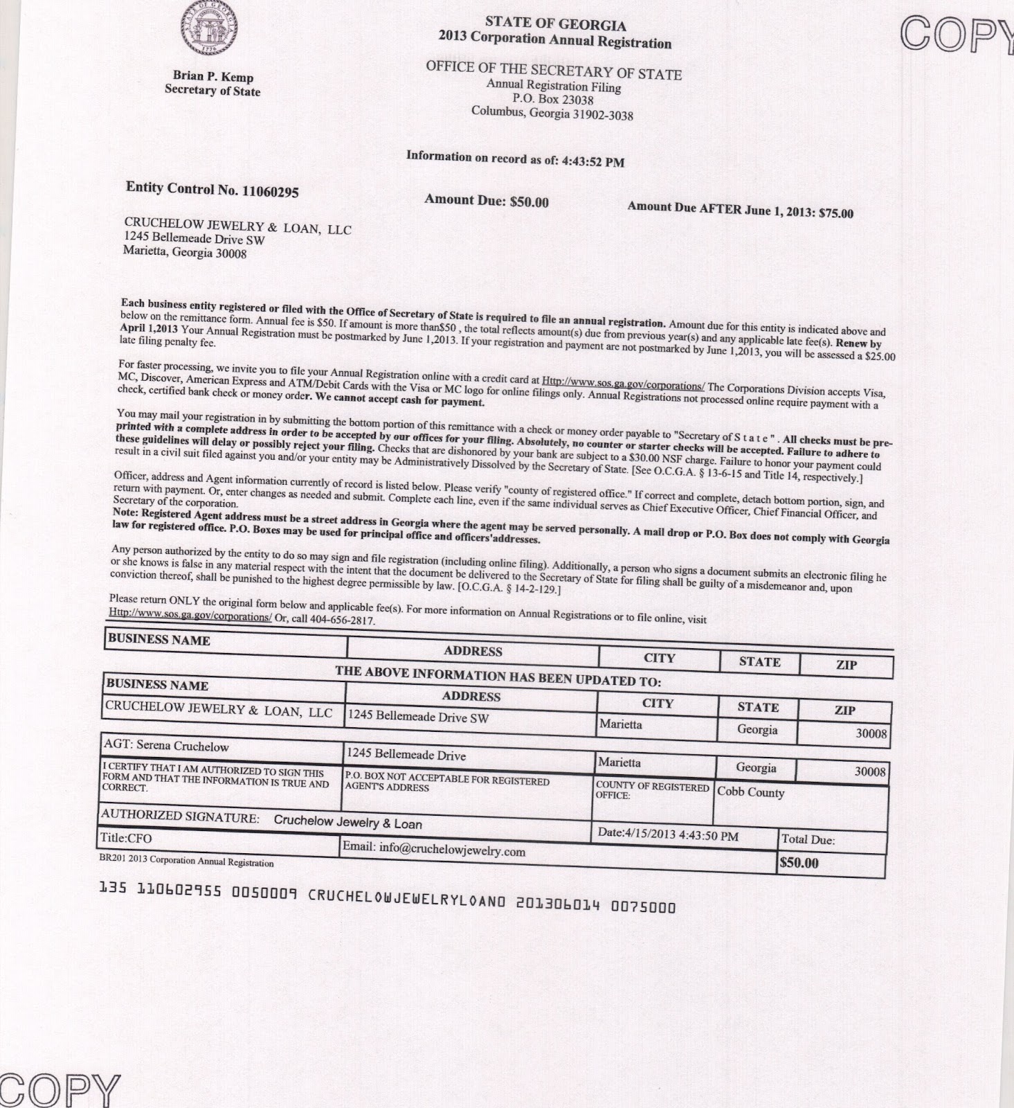 5 pages from yelp.com are at the end of this post. You can see this on their site at: http://www.yelp.com/biz/cruchelow-jewelry-and-loan-kennesaw, however I suspect that it will shortly be removed, so if you want the original content you might also save it on your own computer.